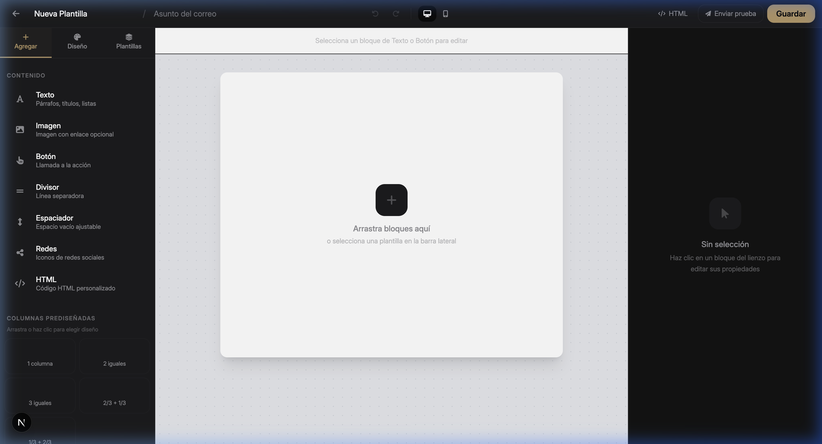 Diseña emails con bloques de texto, imagen, botón y HTML. Envía pruebas al instante.