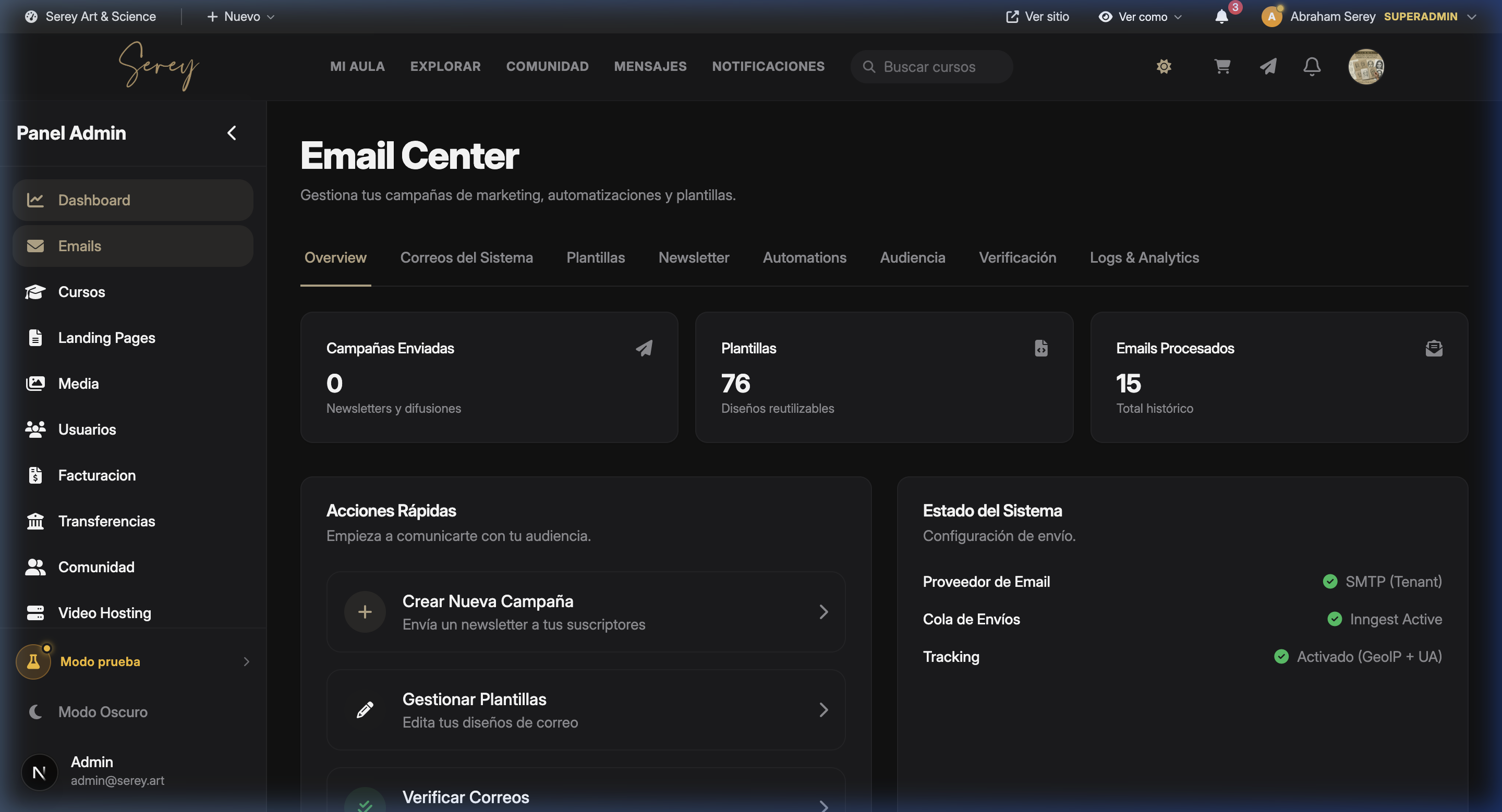 Cursos, comunidad, pagos, IA y marketing en un solo flujo. Cada bloque existe para mejorar conversion, retencion y control operativo.